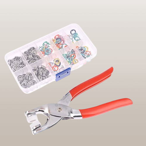 طقم كماشة تركيب الكباسين والأزرار المعدنية. أداة يدوية قوية بمقابض مريحة لتثبيت الأزرار المعدنية بسهولة واحترافية على الأقمشة والجلود. يأتي مع صندوق تخزين يحوي مجموعة متنوعة من الكباسين الجاهزة للاستخدام الفوري في جميع مشاريعك اليدوية.